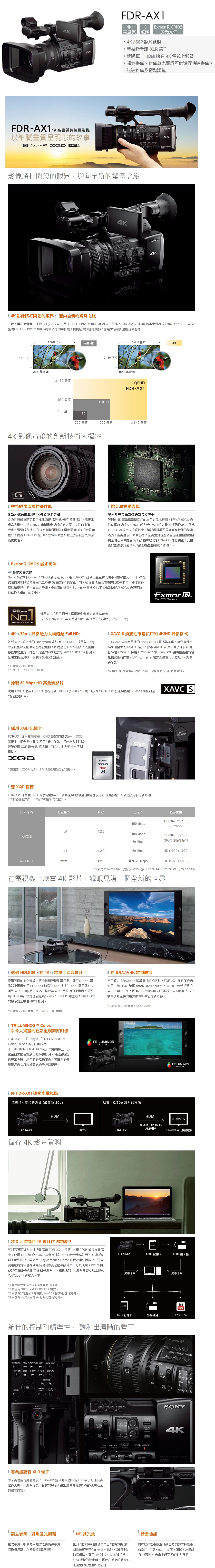 產品型號: FDR-AX1隨機附件: 充電器、充電電池、電源供應器、電源線*2、A/V 連接線、HDMI 線、USB 線