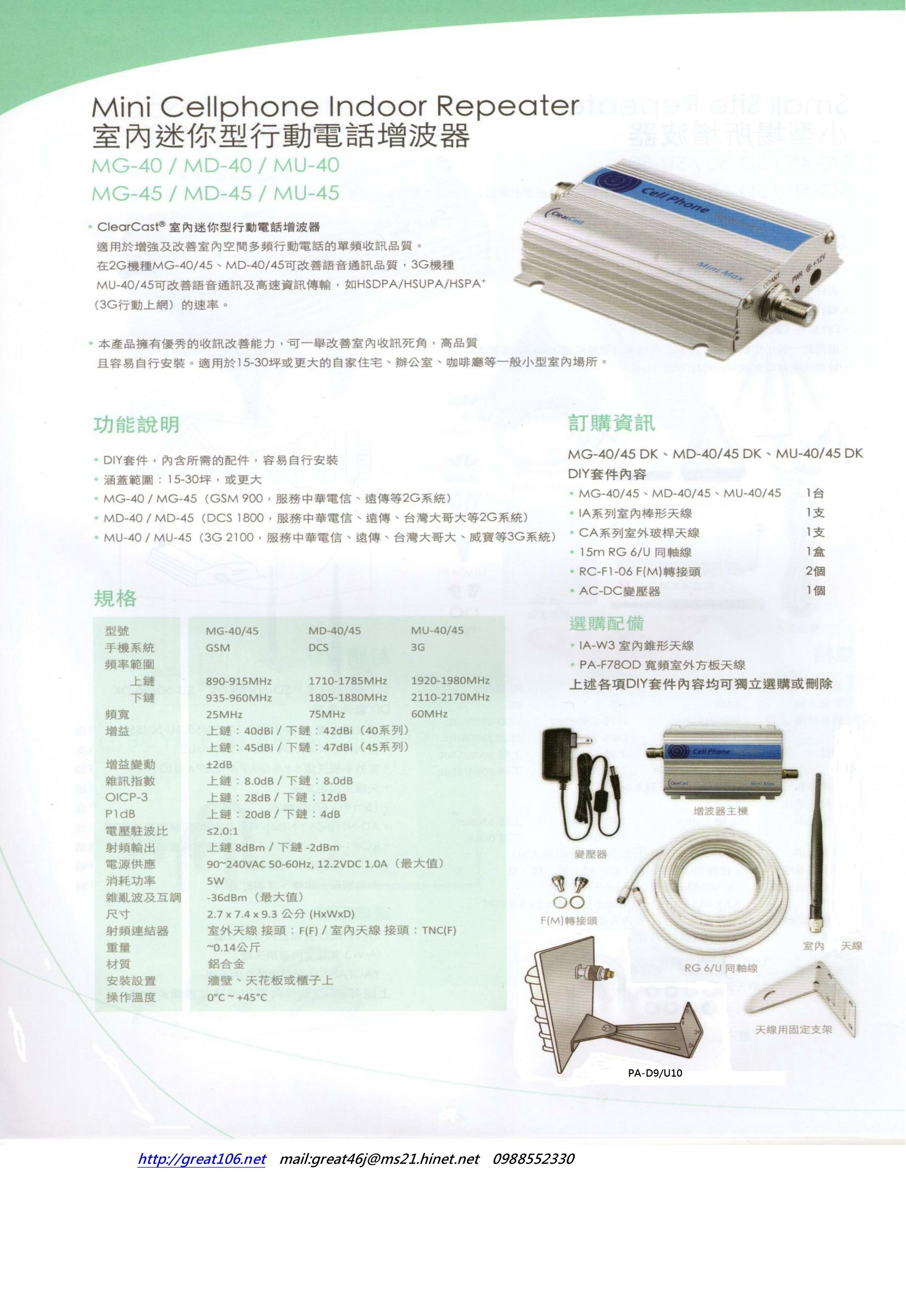 MU-45(3G)含室外防水型天線.增波器.同軸電纜RG-6x10M.約10~20坪(無隔間)中華.遠傳.台哥大.威寶電信系統(3G通話.3.5G上網) MD-45 LTE(1800)含室外防水型天線.增波器.同軸電纜RG-6x10M.約10~20坪(無隔間).中華.遠傳.台哥大電信系統2G通話.4GLTE中華.遠傳.台哥大電信電信系統(高速上網) MG-45 4G LTE(900)含室外防水型天線.增波器.同軸電纜RG-6x10M.約10~20坪(無隔間)台灣之星(4G上網及Volte通話).中華電信4GLTE上網.山區或偏遠地區及外島2G通話
