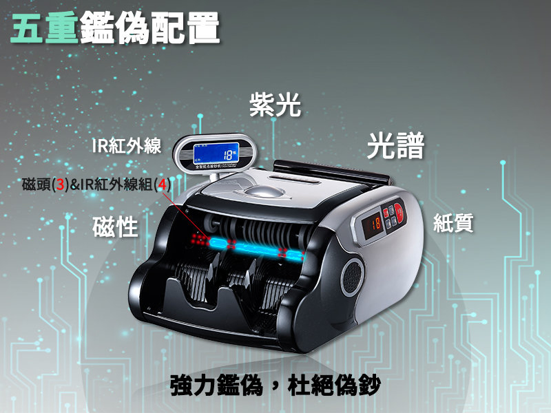 五重鑑偽/智慧識別/鋼琴烤漆/操作便利/品質卓越 特點:◎雙螢幕顯示、人性化設計、節能省電 ◎多種幣別檢測、智能綜合檢驗◎磁性檢驗、IR紅外線檢驗 ◎光譜檢驗、紙質檢驗、紫光檢測等 ◎多項 -