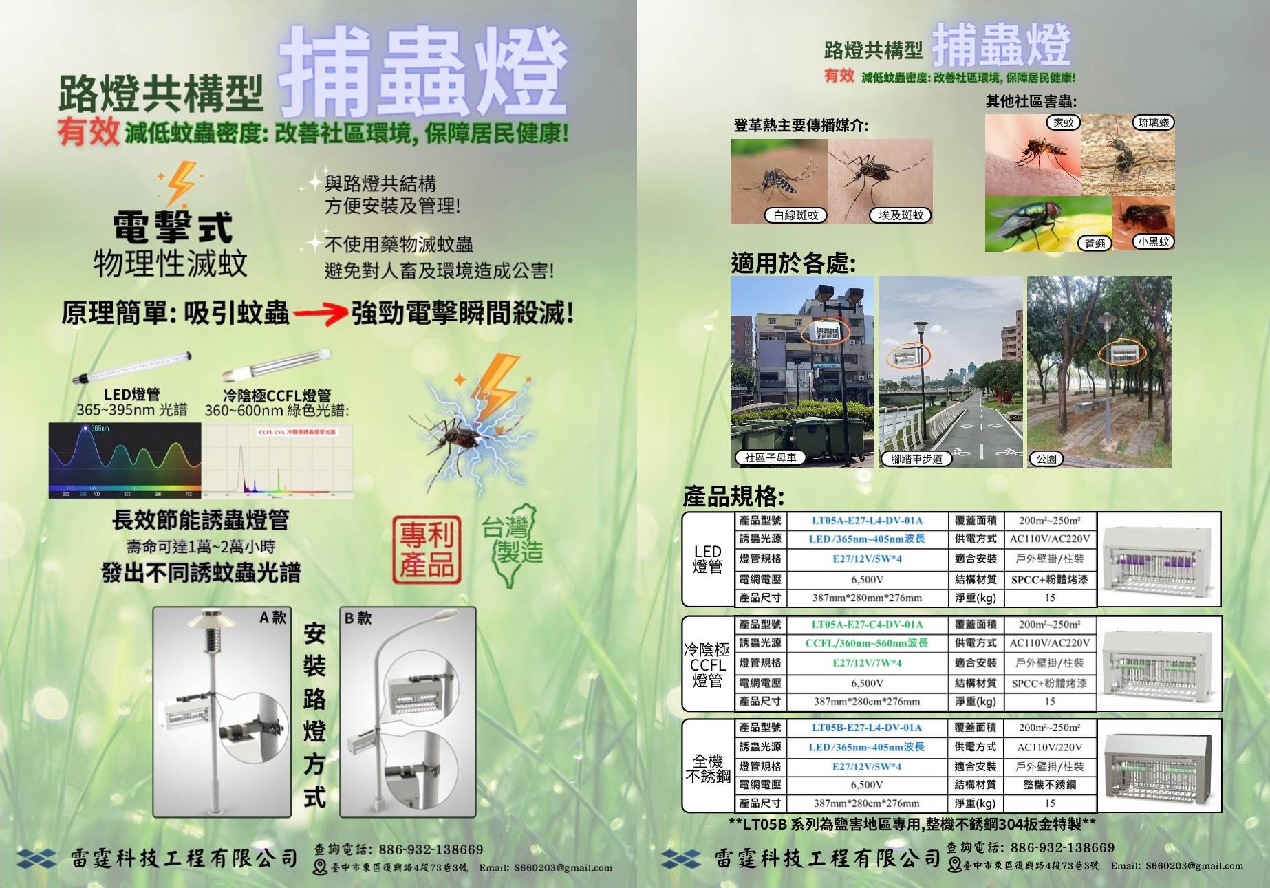 首創戶外型路燈共構滅蚊燈,採用電擊式物理性滅蚊,不使用藥物滅蚊蟲