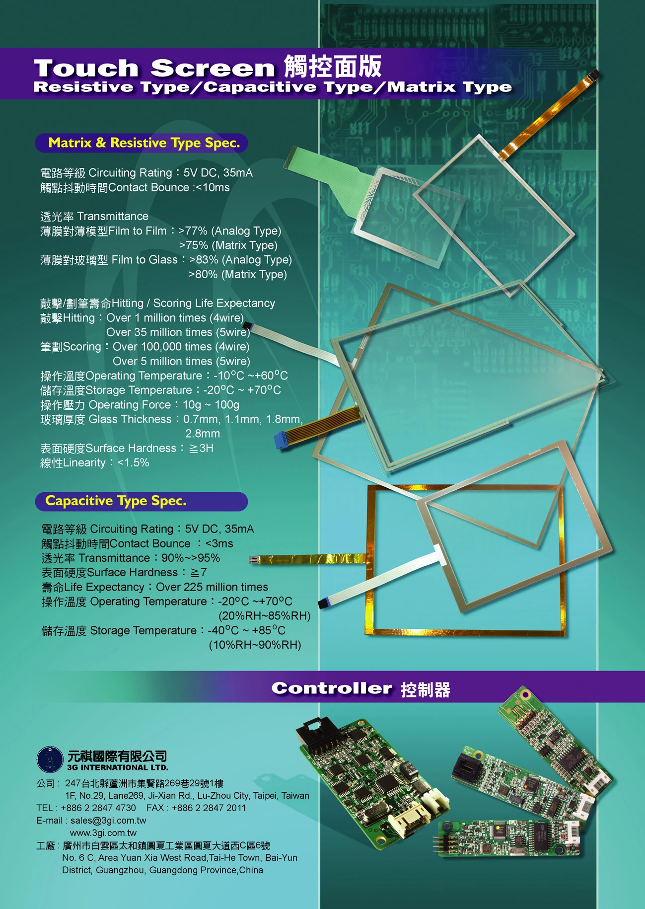 目前可以實現單點觸控及多點觸控操作,提供客戶更多的選擇。 觸控面版類別:電阻式(類比式):有四線/五線/八線/多點電阻 數位式(距陣式):OEM 電容式:投射式電容/表面式電容 |