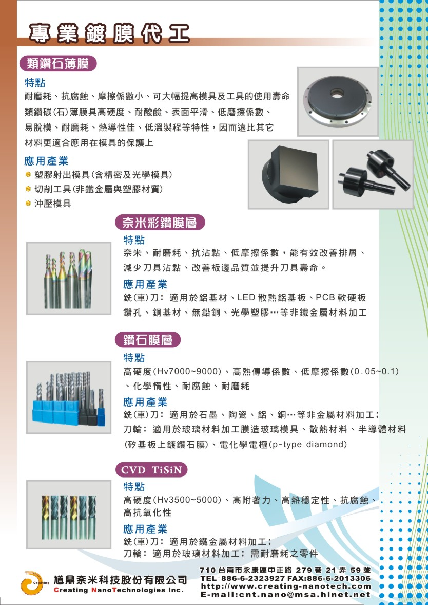 應用於銑(車)刀﹕適用於鋁基材、LED 散熱鋁基板、PCB 軟硬板鑽孔、銅基材、無鉛銅、光學塑膠…等非鐵金屬材料加工 -