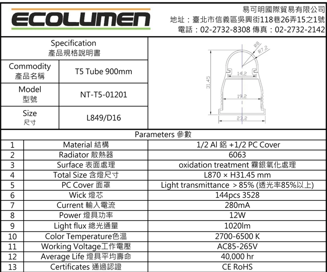 由易泰光電有限公司研發生產的LED T5燈管,分別為2呎10W和4呎20W的設計,其特色是它和燈座為一體成型設計
