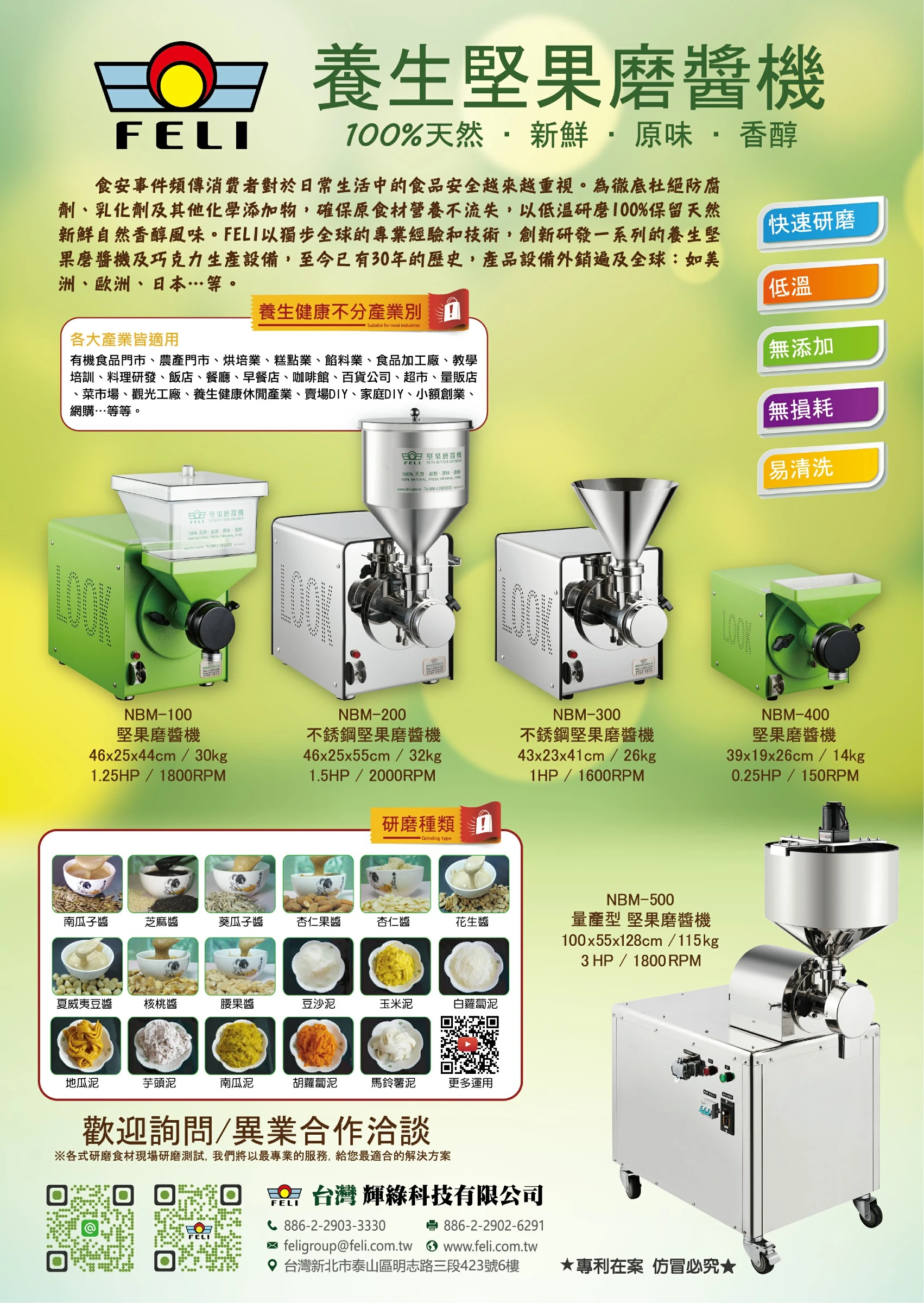 FELI NBM-300不銹鋼堅果磨醬機 100%天然、新鮮、原味、香純專業研發,採用高馬力低溫研磨加工方式